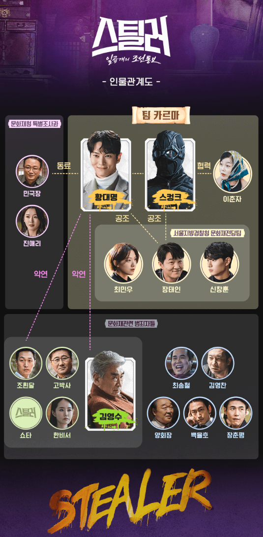성스러운 아이들이 종영을 하고 후속으로 나온 새 수목드라마 <스틸러: 일곱 개의 조선통보>는 문화재 도둑 '스컹크'와 비공식 문화재 환수팀 '카르마'가 뭉쳐 법이 심판하지 못하는 자들을 상대로 펼치는 케이퍼 코믹 액션. 주인공으로 주원 배우가 각시탈에 이어서 한번 더 한국판 슈퍼히어로와 같은 역할을 맡았다. 기대되는 새 수목드라마 <스틸러: 일곱 개의 조선통보>의 방송시간, 등장인물, 인물관계도와 줄거리에 대해서 알아보았다.